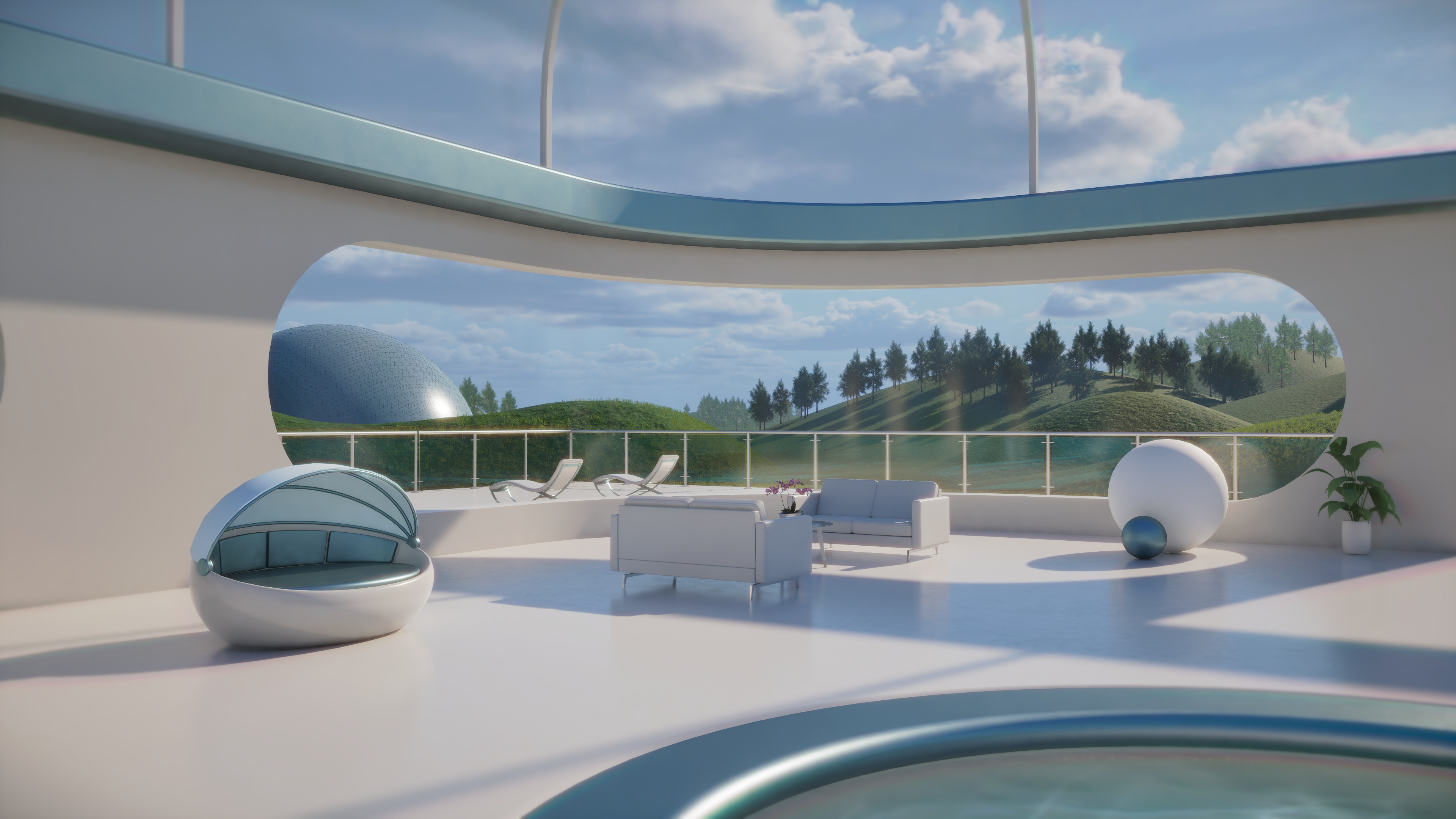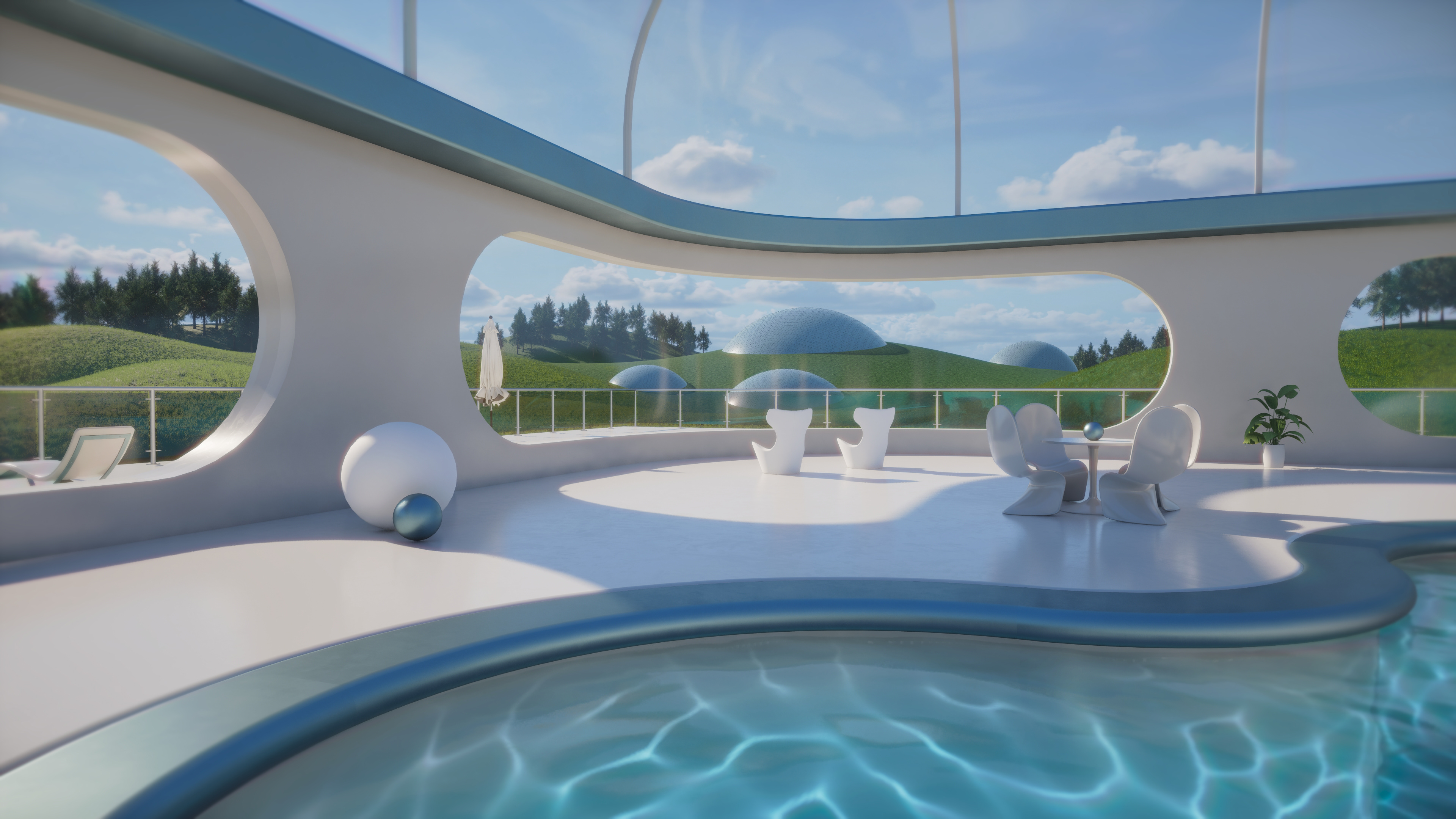 Inspired by retro-futurist architecture and calm, meditative design. This concept imagines a serene pool pavilion from an optimistic future, where light, water, and minimalist forms offer a peaceful retreat from the everyday.