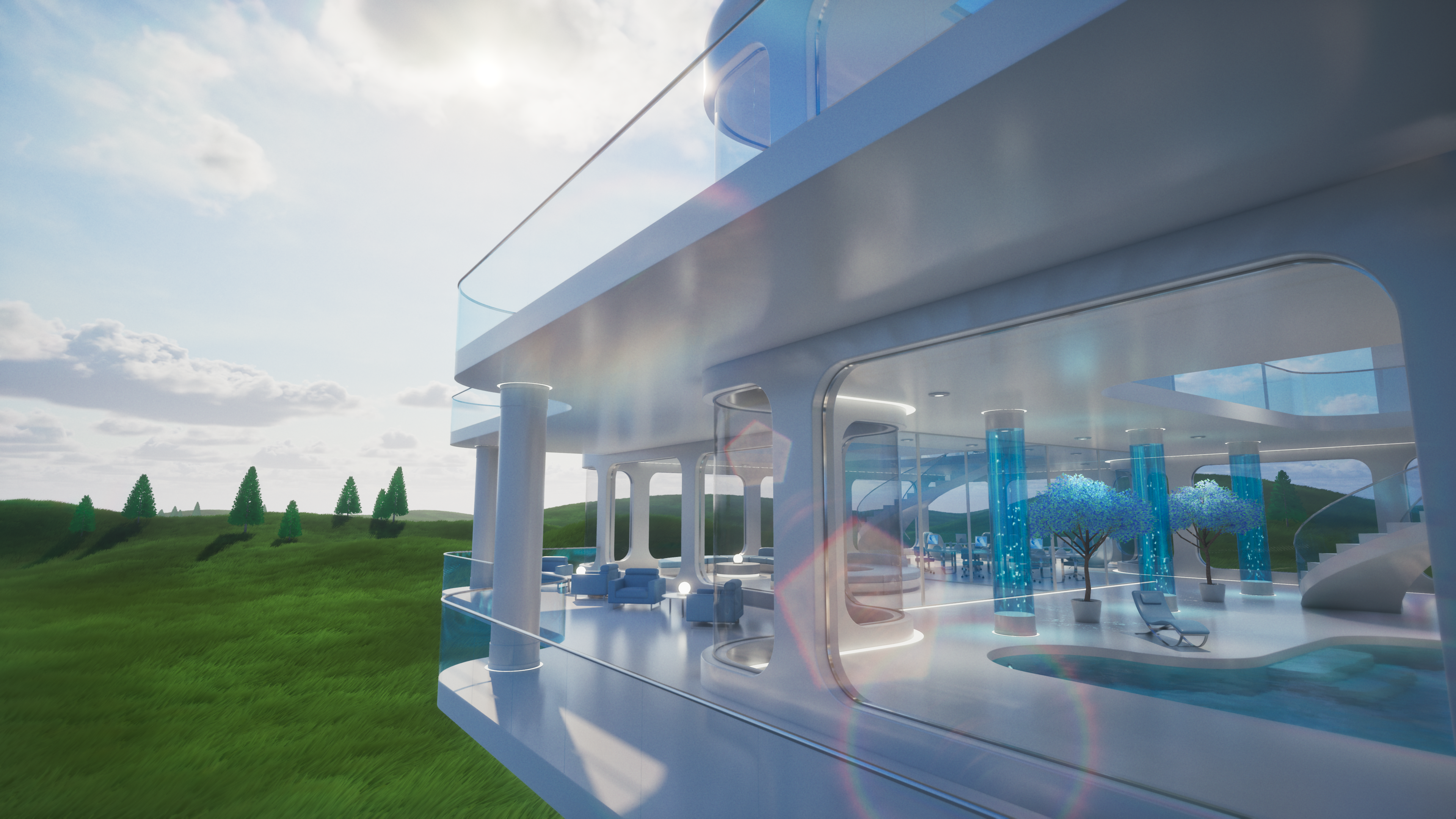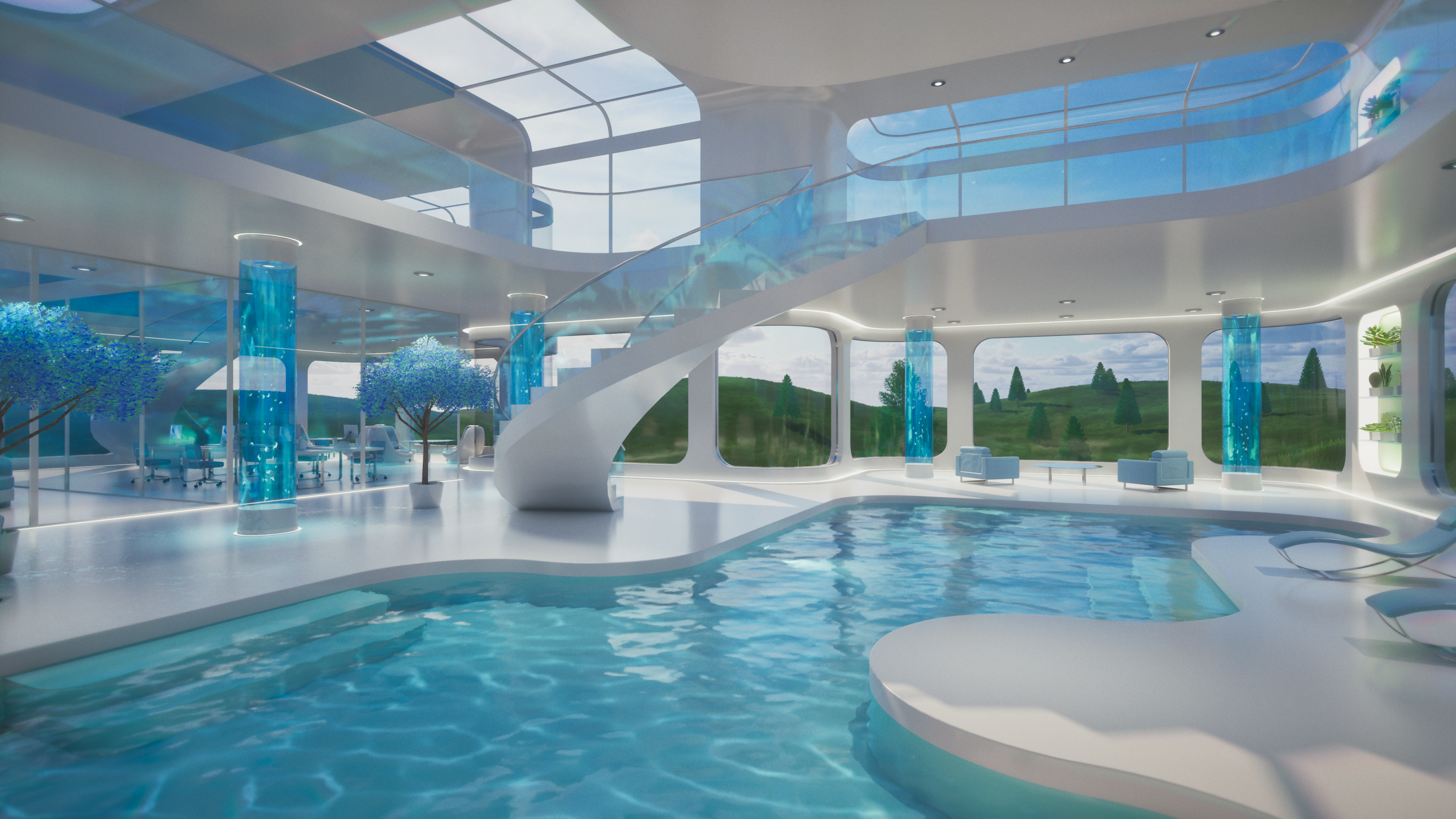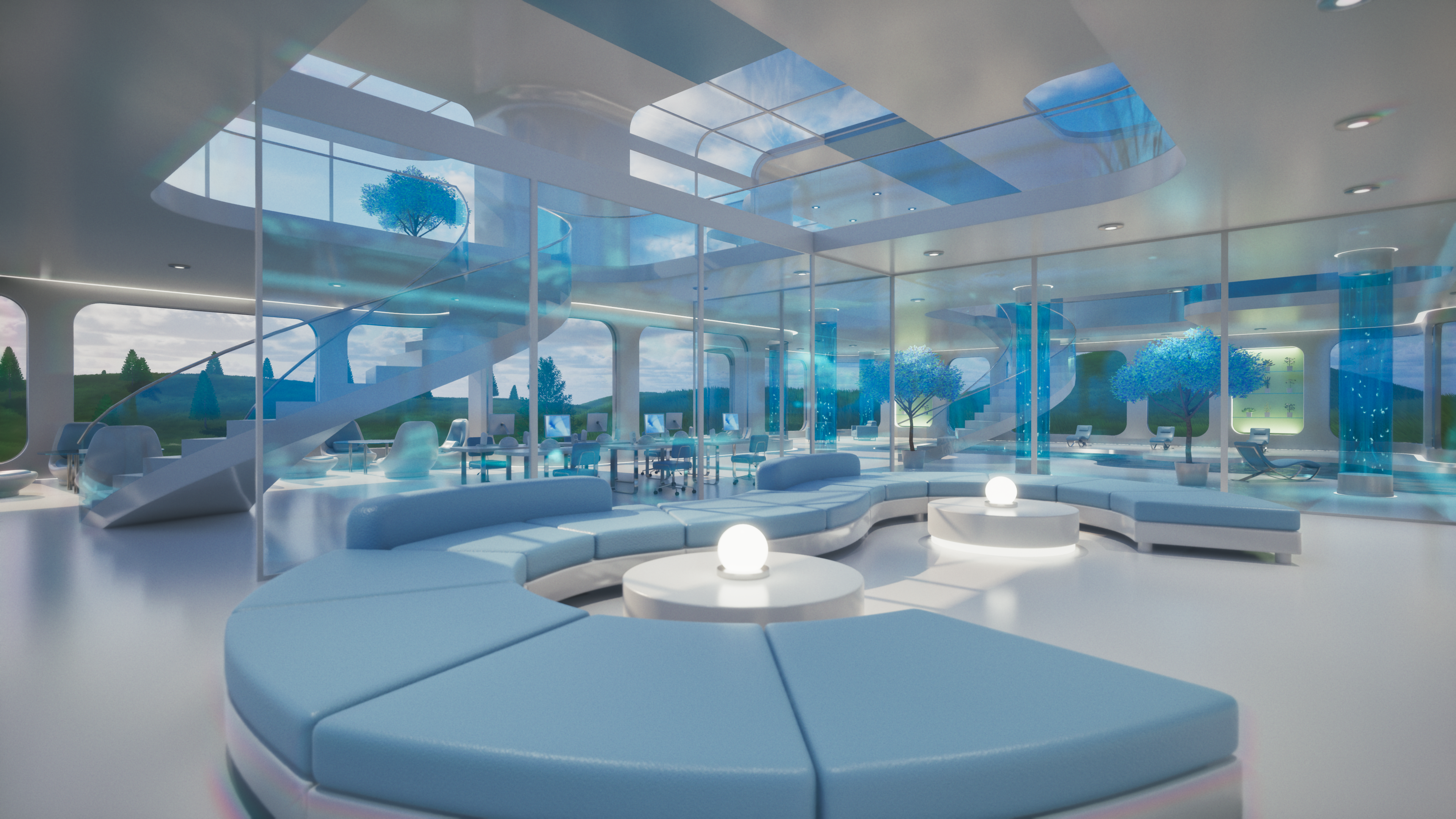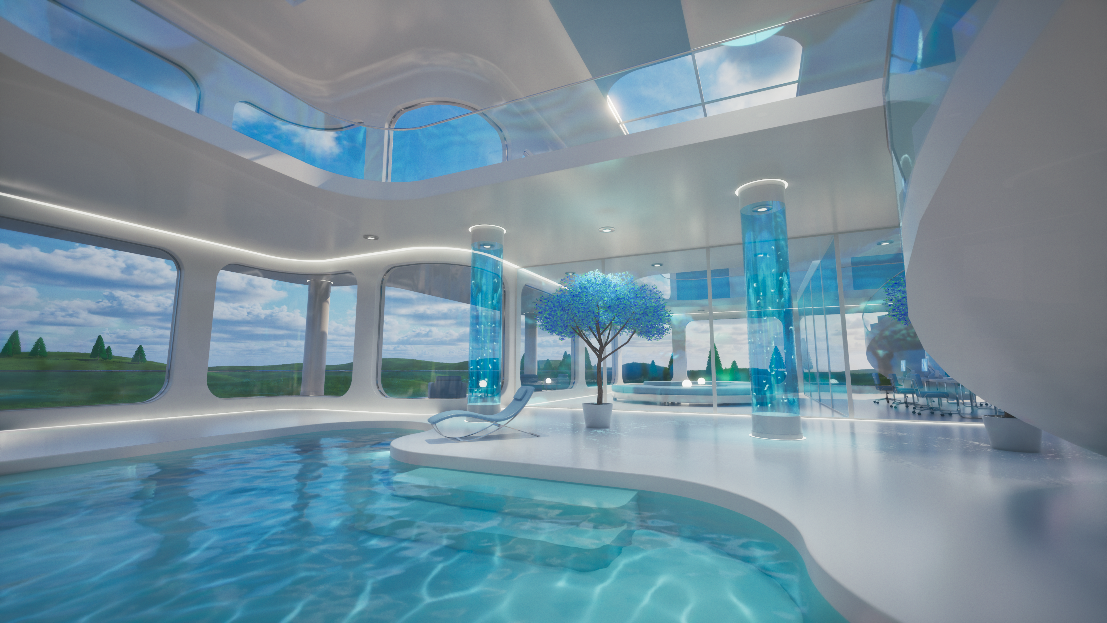 Glass Tomorrow is a video project inspired by Y2K futurism, Frutiger Aero aesthetics, and retrofuturist interiors, blending sleek minimalism with luminous, organic reflections. The piece imagines a near-future sanctuary where glass, water, and light define both structure and atmosphere, creating an ambience that feels both utopian and liminal.