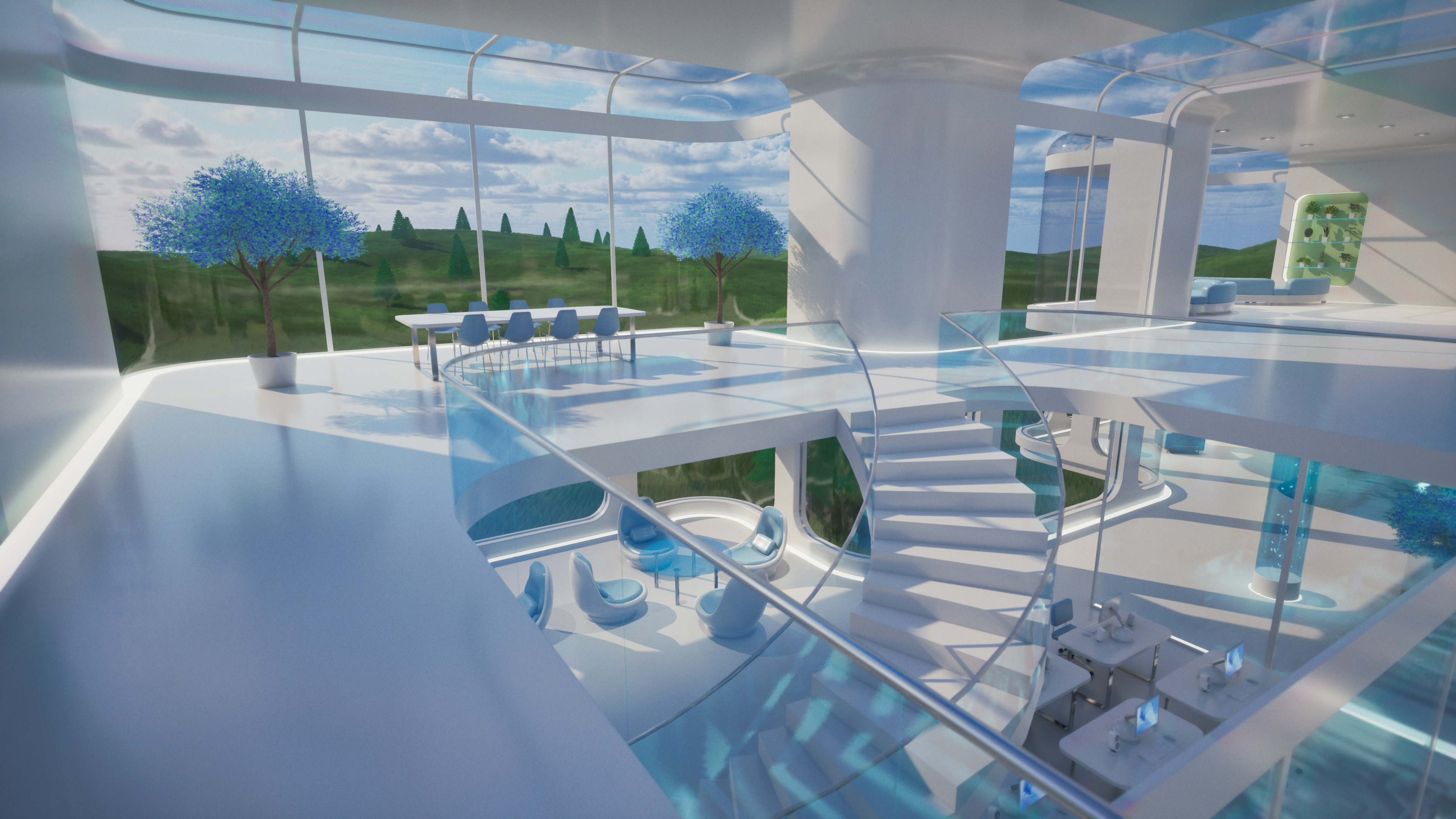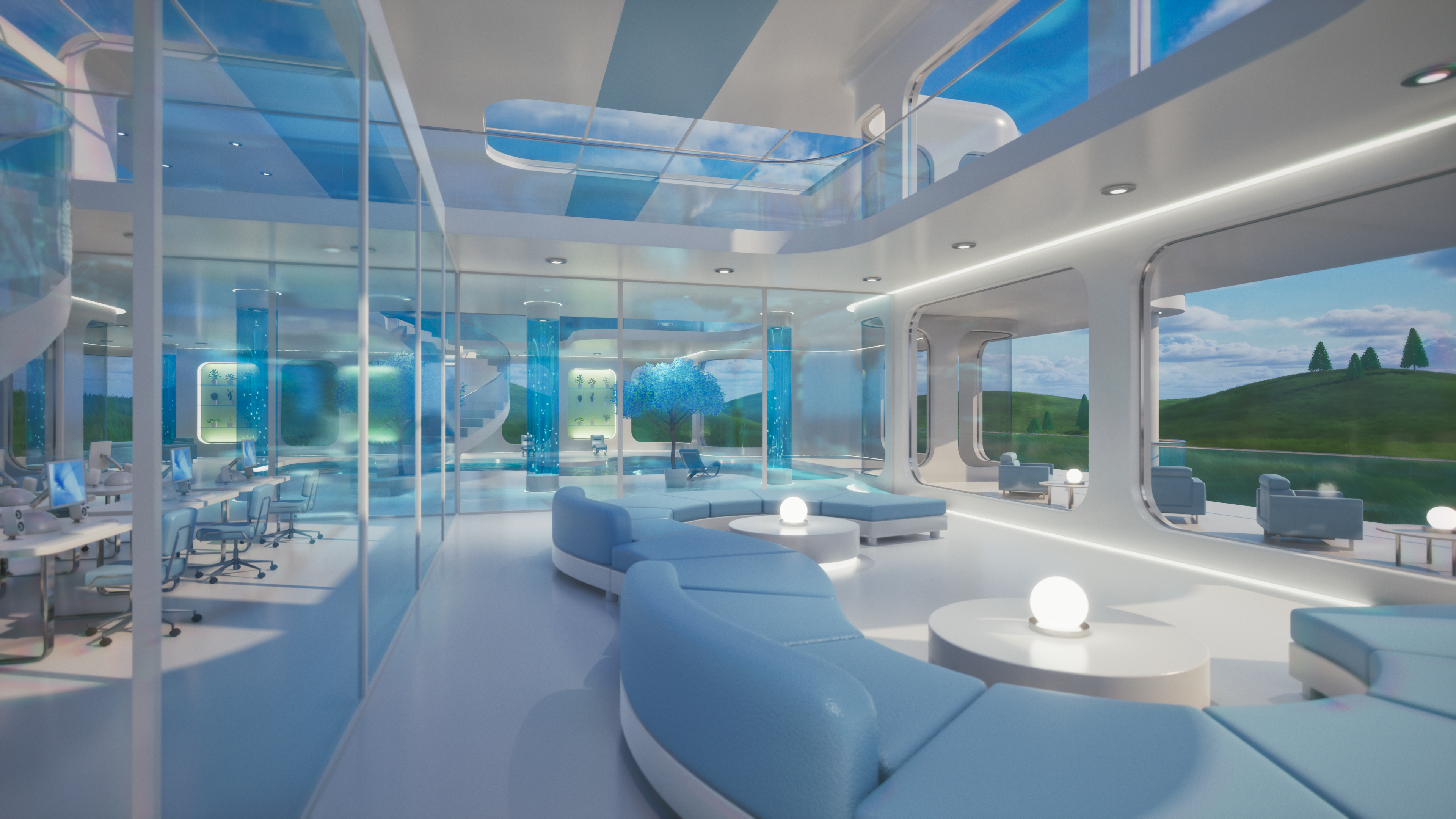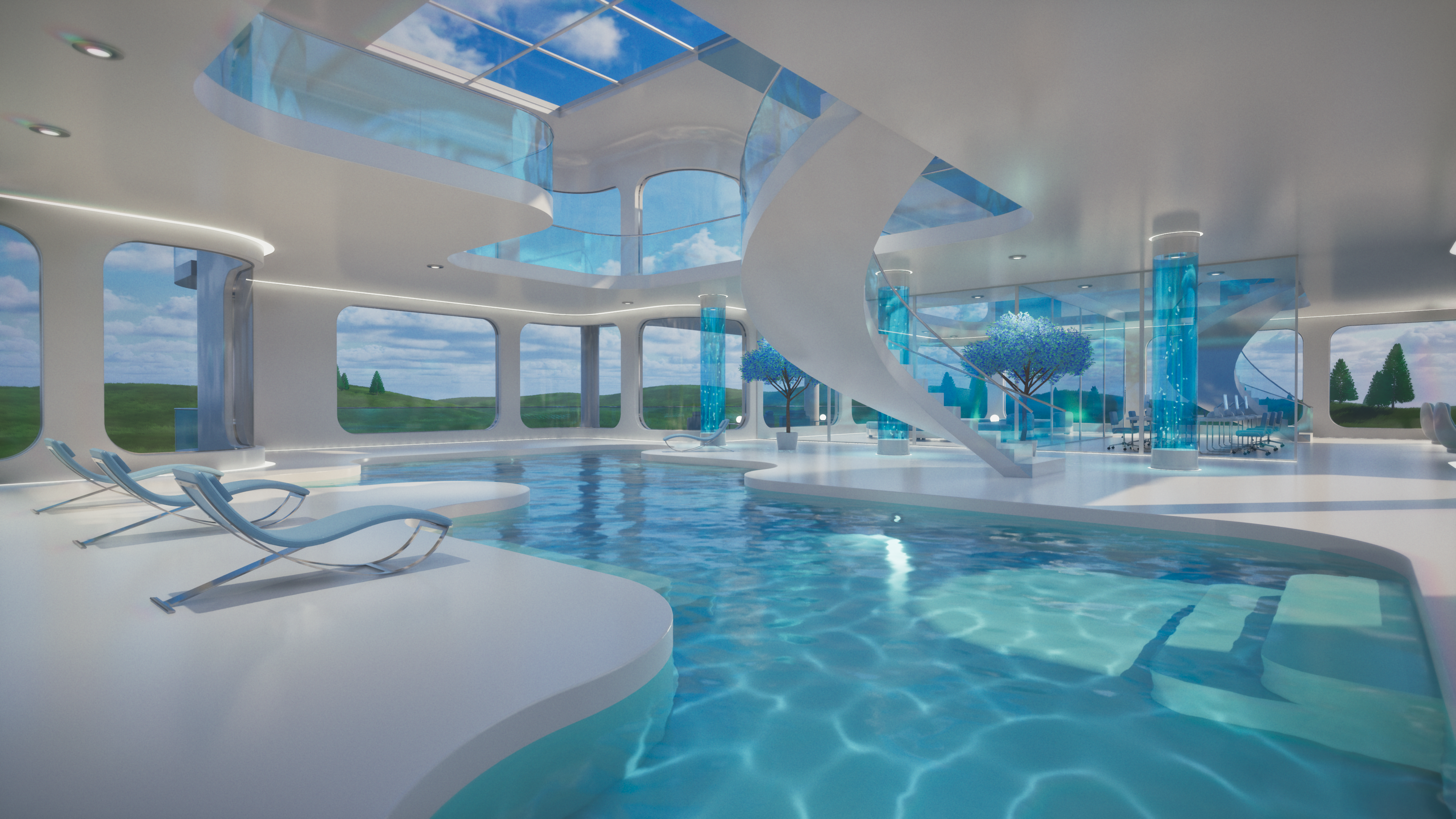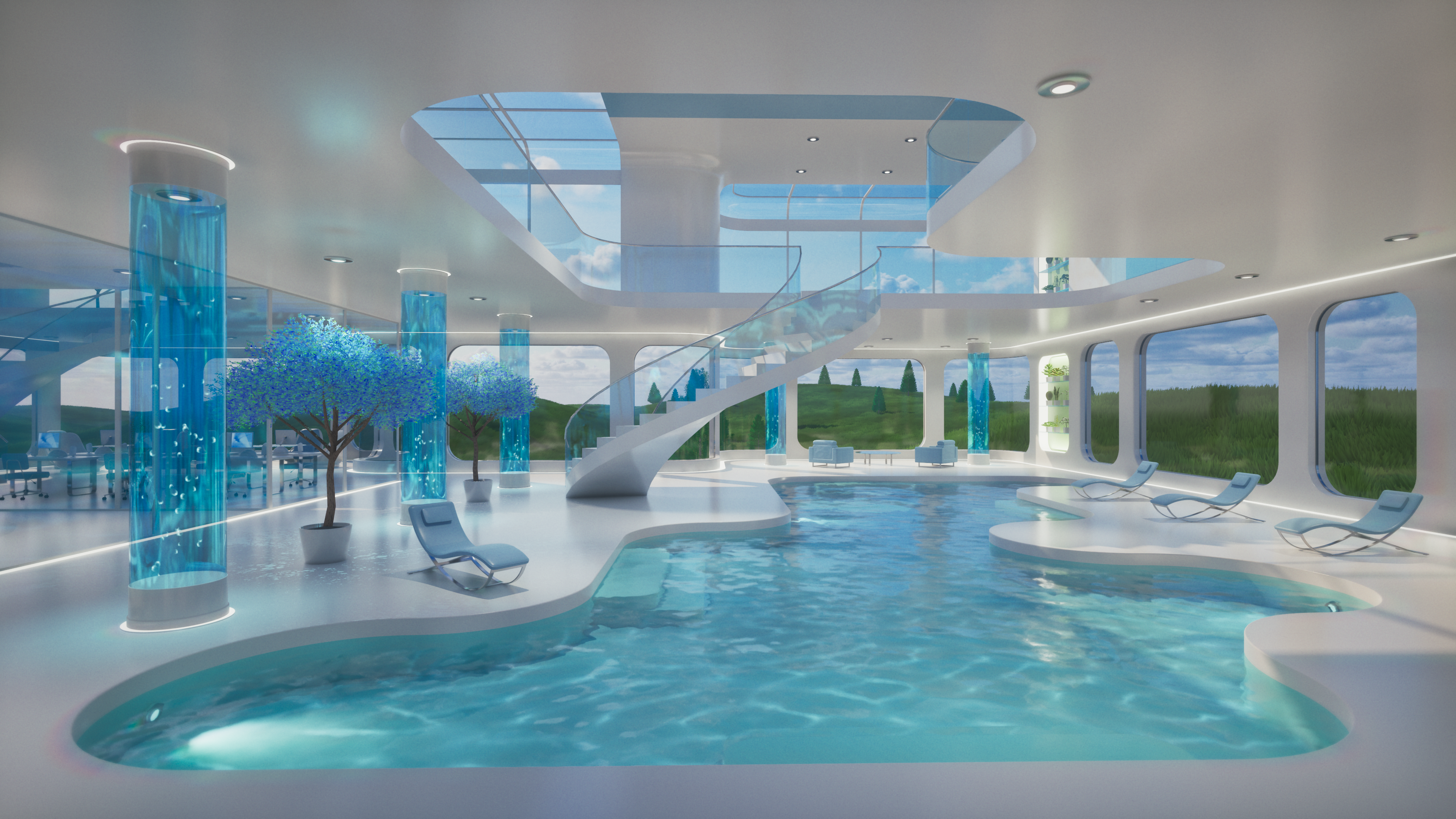 Glass Tomorrow is a video project inspired by Y2K futurism, Frutiger Aero aesthetics, and retrofuturist interiors, blending sleek minimalism with luminous, organic reflections. The piece imagines a near-future sanctuary where glass, water, and light define both structure and atmosphere, creating an ambience that feels both utopian and liminal.