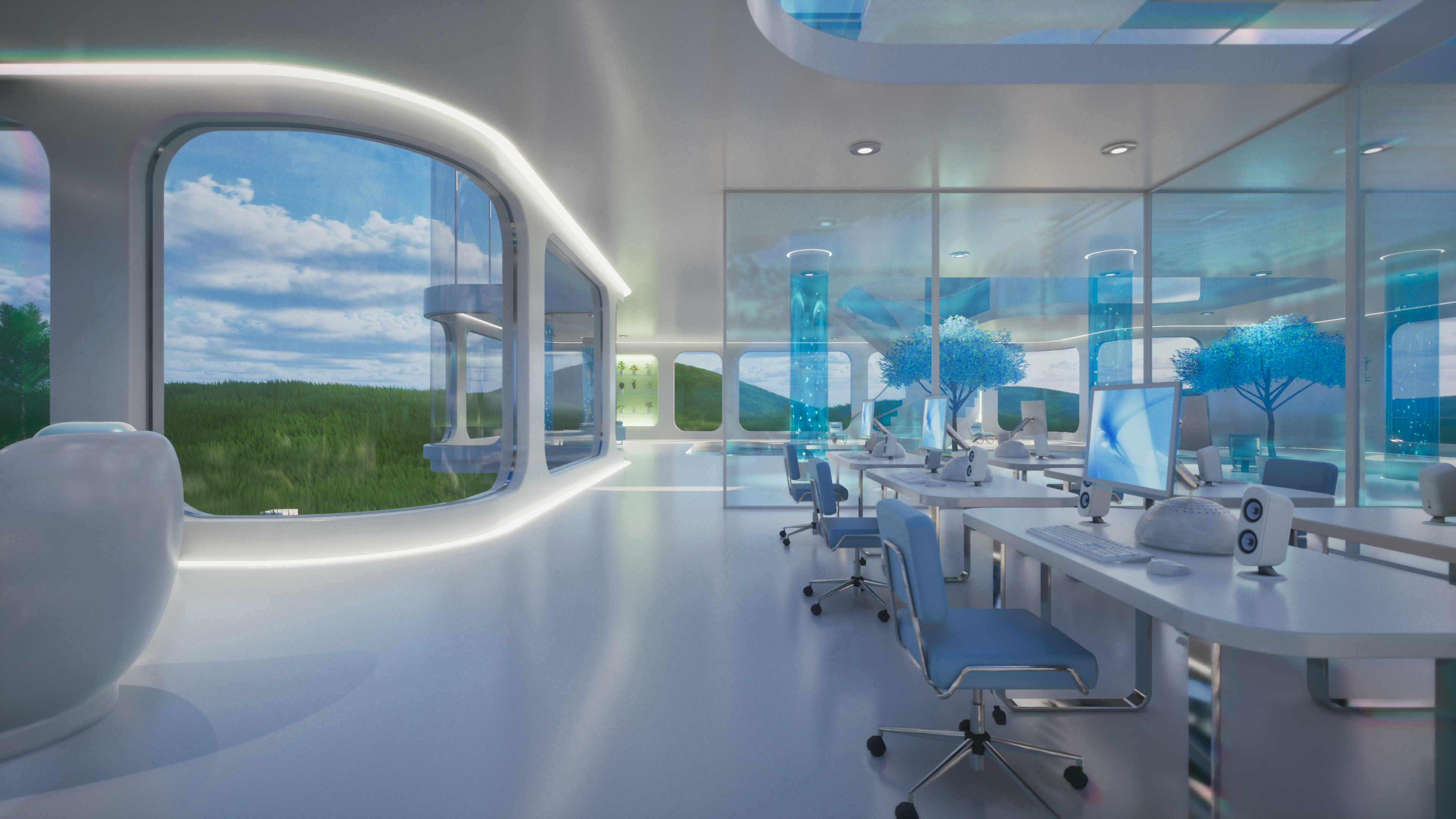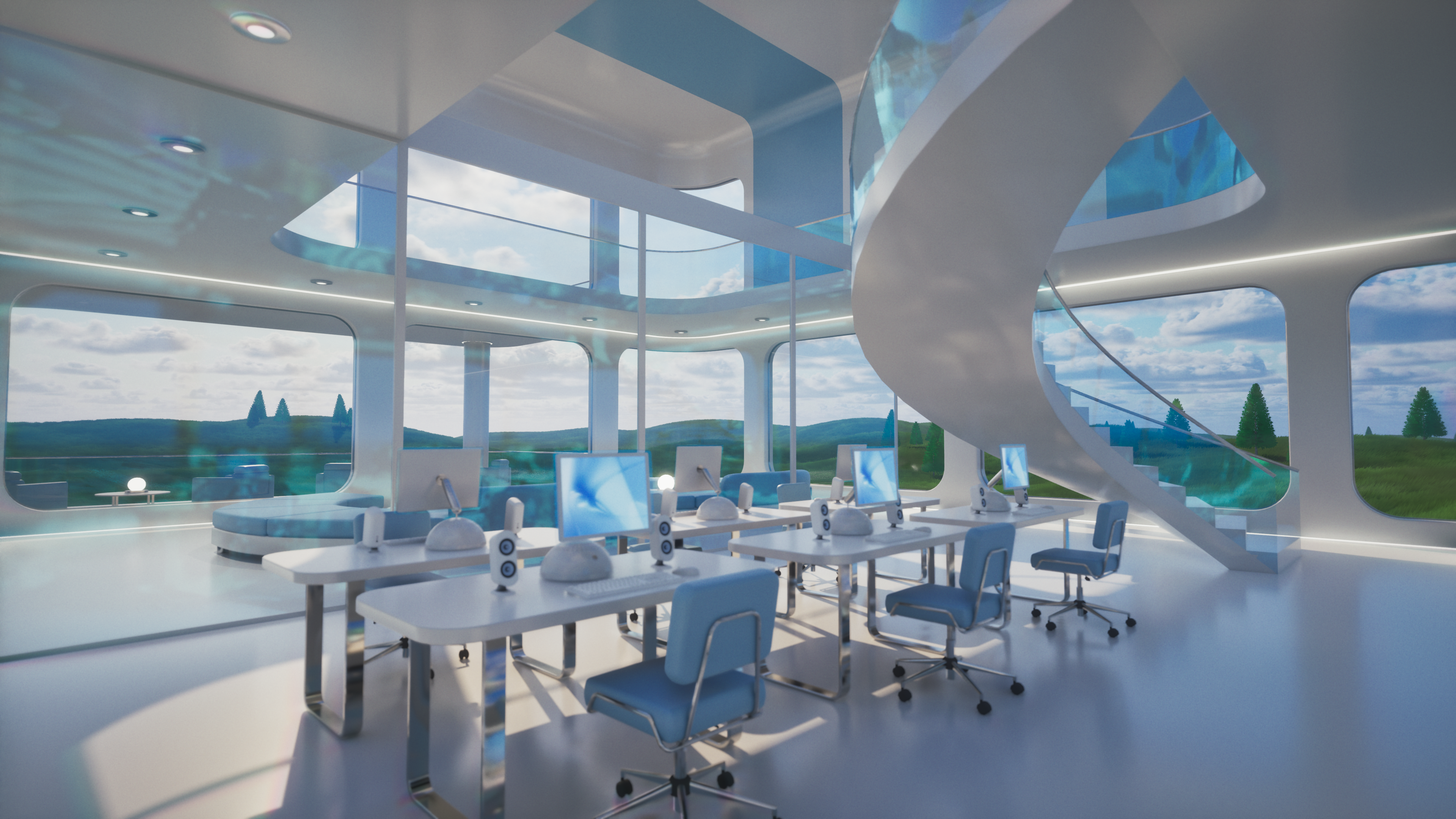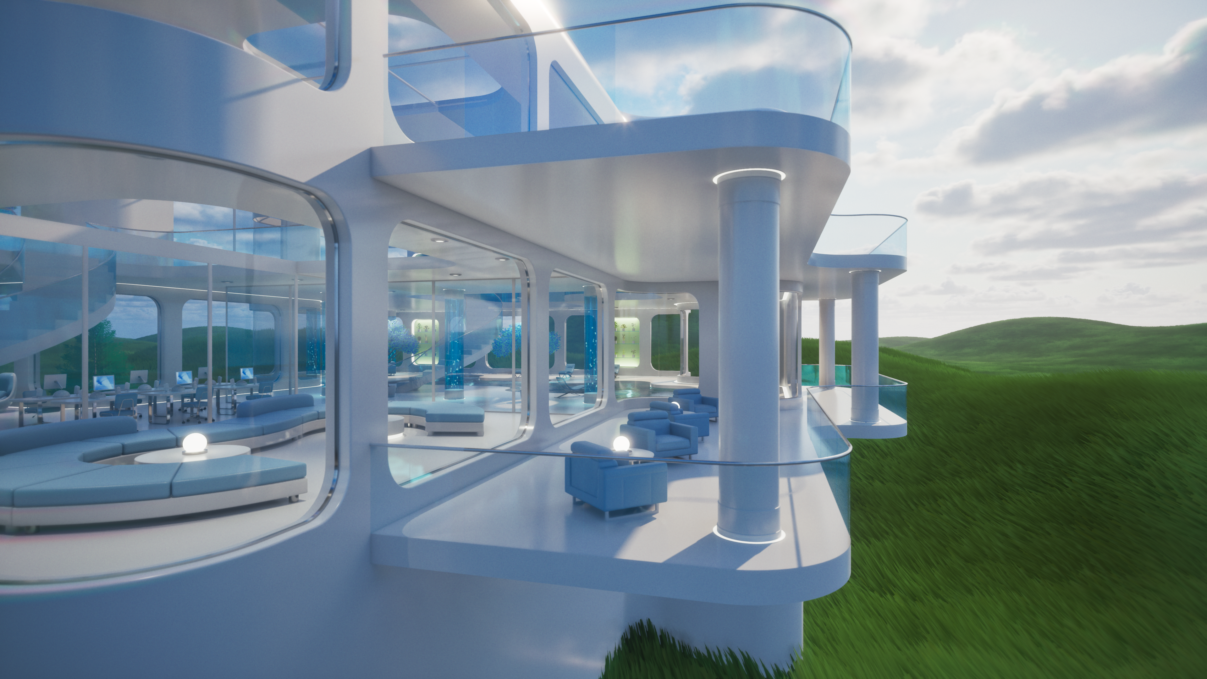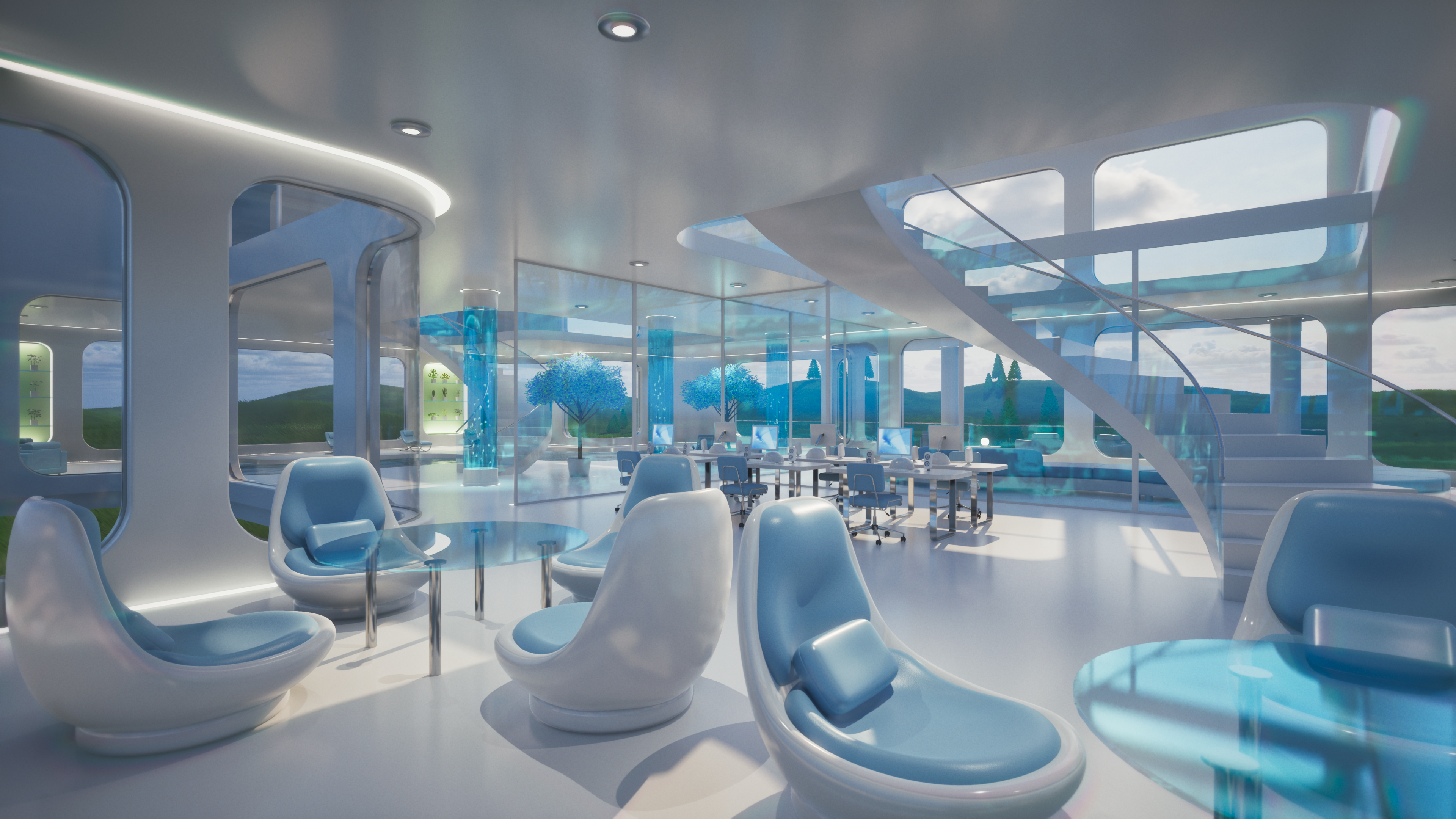 Glass Tomorrow is a video project inspired by Y2K futurism, Frutiger Aero aesthetics, and retrofuturist interiors, blending sleek minimalism with luminous, organic reflections. The piece imagines a near-future sanctuary where glass, water, and light define both structure and atmosphere, creating an ambience that feels both utopian and liminal.
