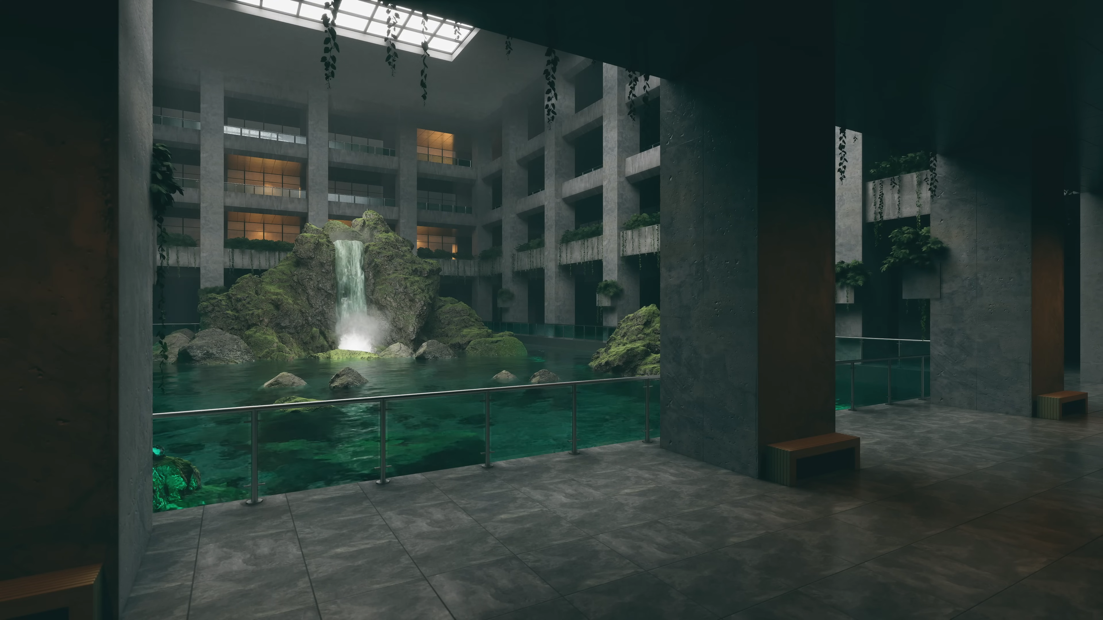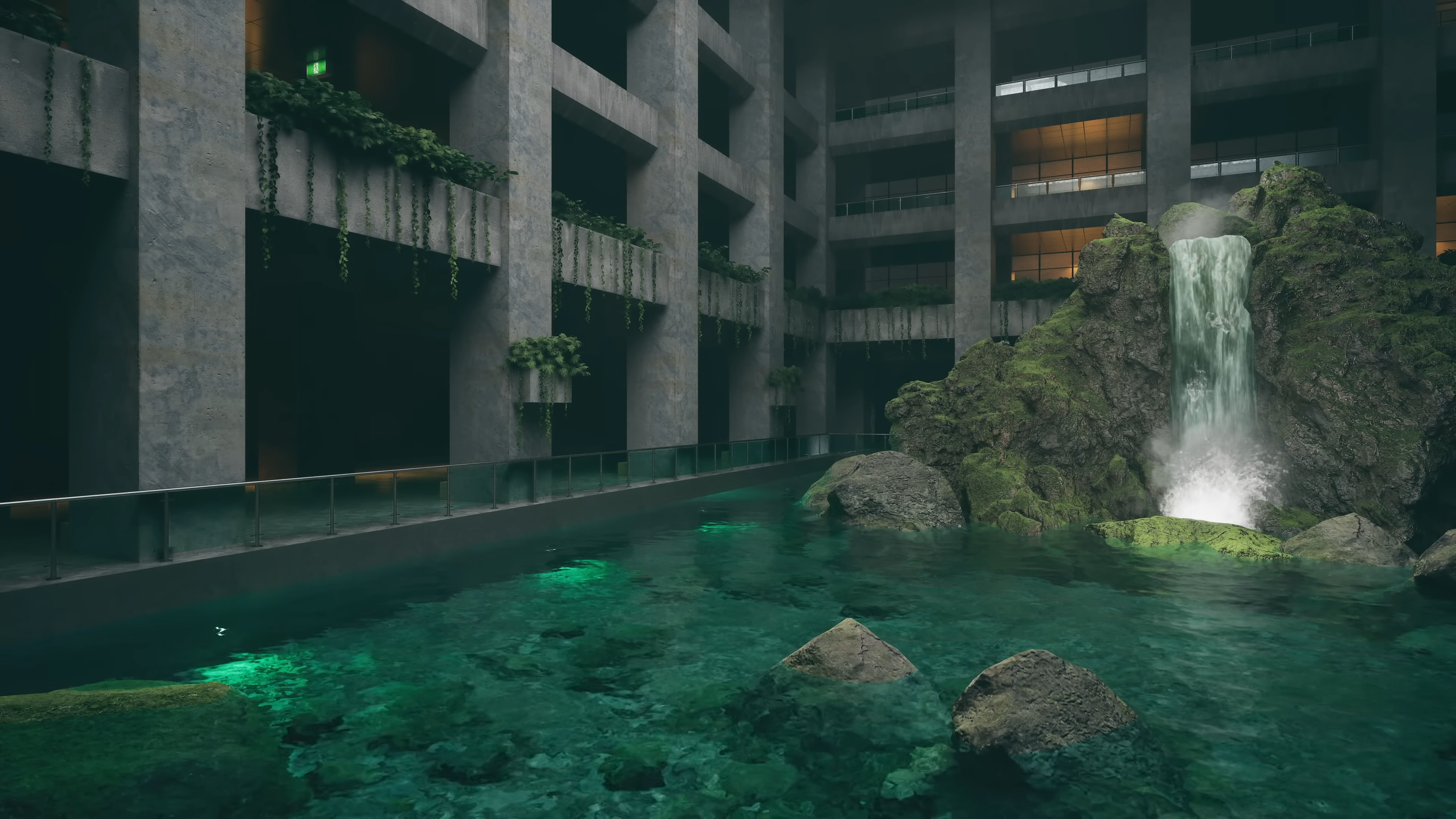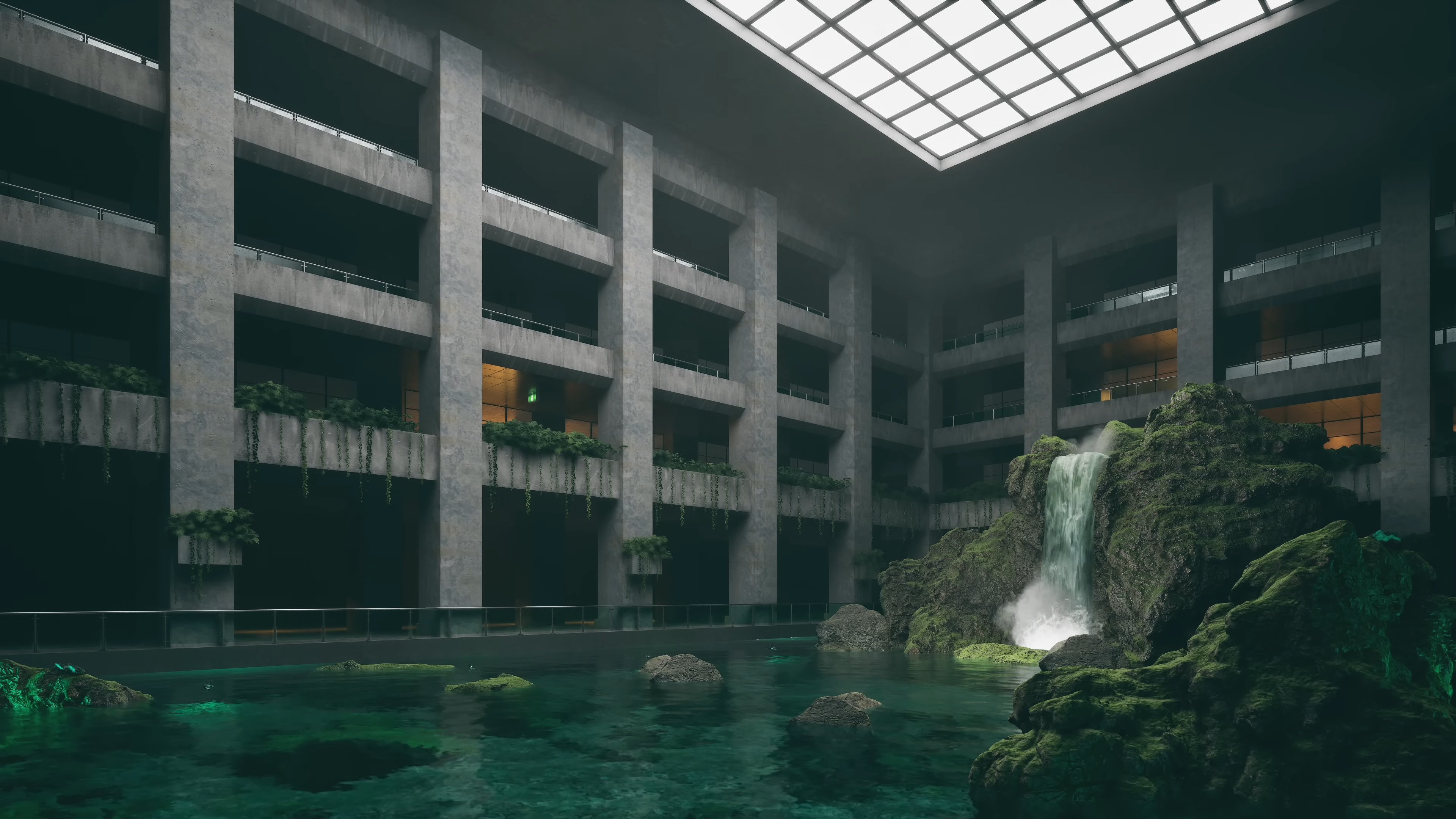 Enter Lost Atrium, an abandoned sanctuary where brutalist architecture and nature intertwine. Towering concrete pillars rise around a still, reflective pool, their surfaces softened by creeping vines and the gentle glow of ambient light. A waterfall cascades down jagged rocks, its sound echoing through the vast, empty halls, filling the space with a sense of quiet solitude.