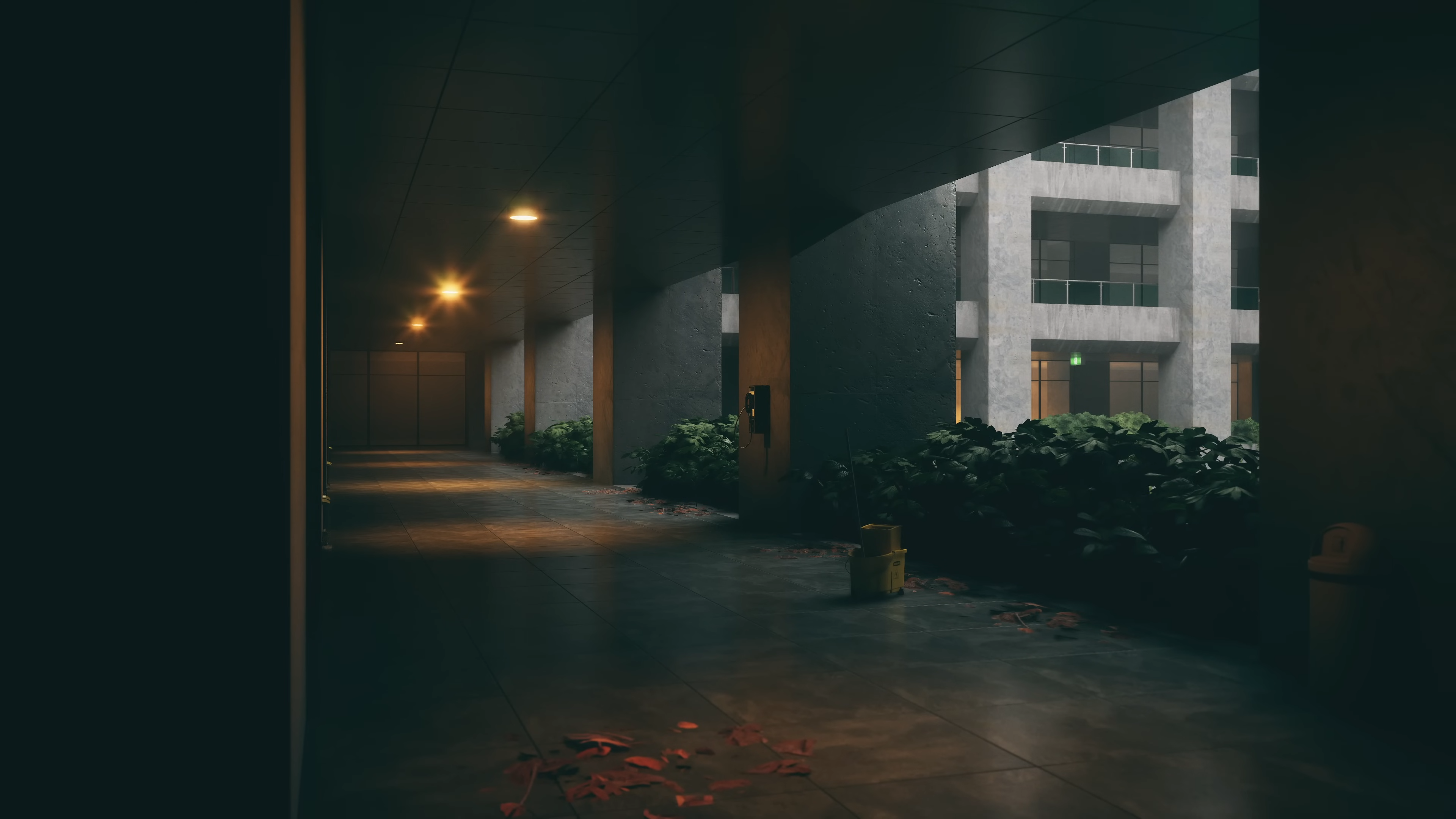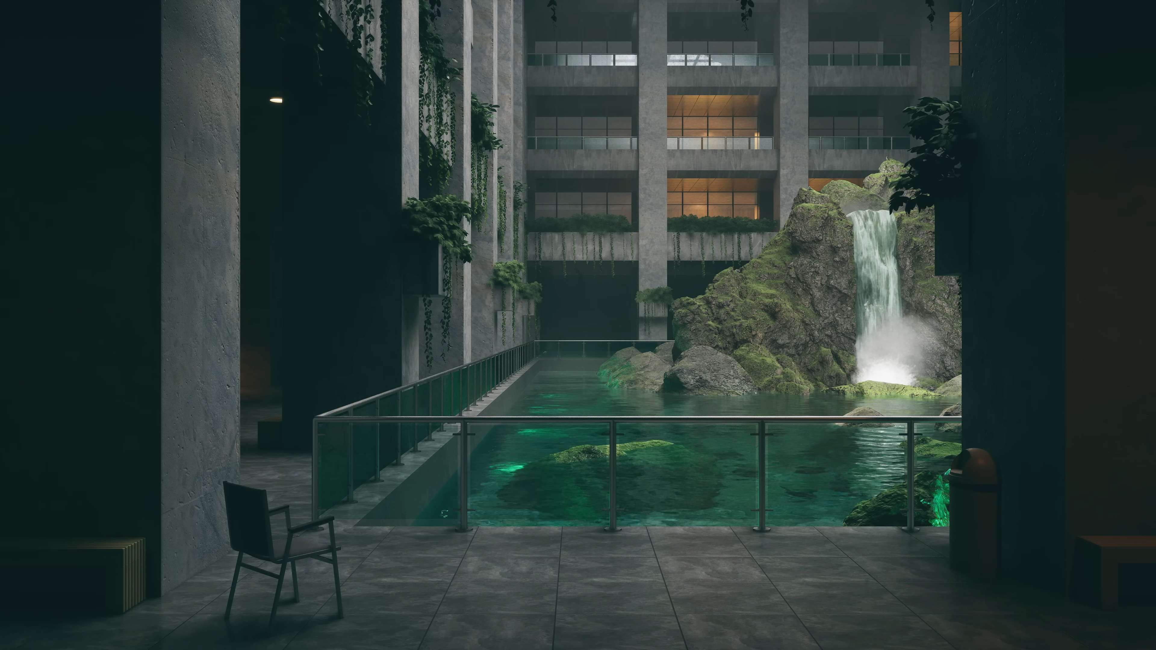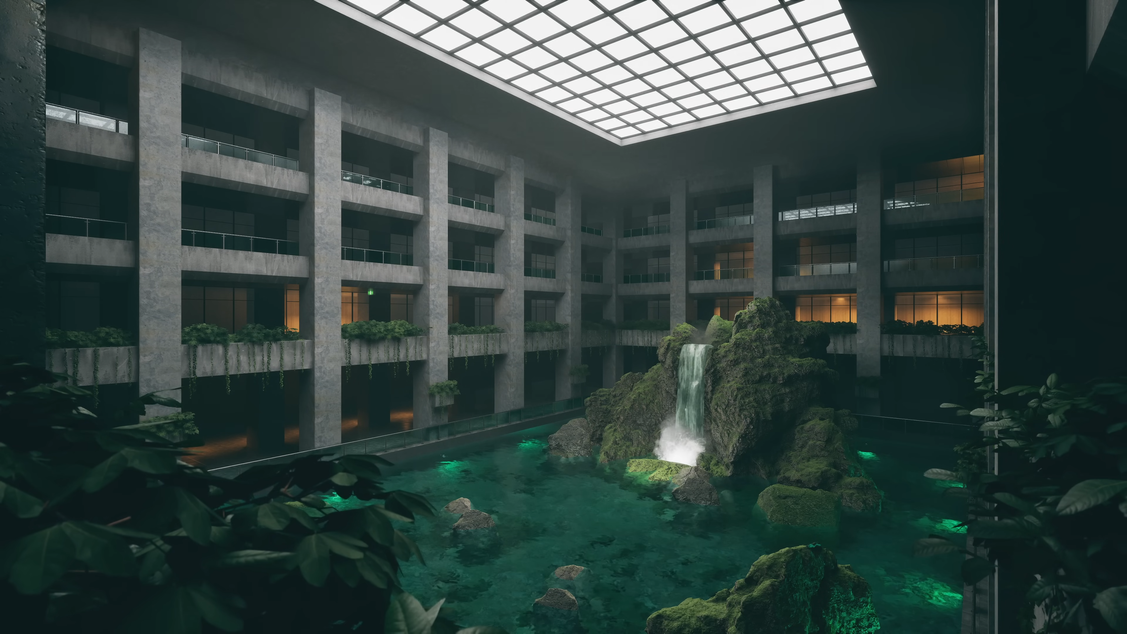 Enter Lost Atrium, an abandoned sanctuary where brutalist architecture and nature intertwine. Towering concrete pillars rise around a still, reflective pool, their surfaces softened by creeping vines and the gentle glow of ambient light. A waterfall cascades down jagged rocks, its sound echoing through the vast, empty halls, filling the space with a sense of quiet solitude.