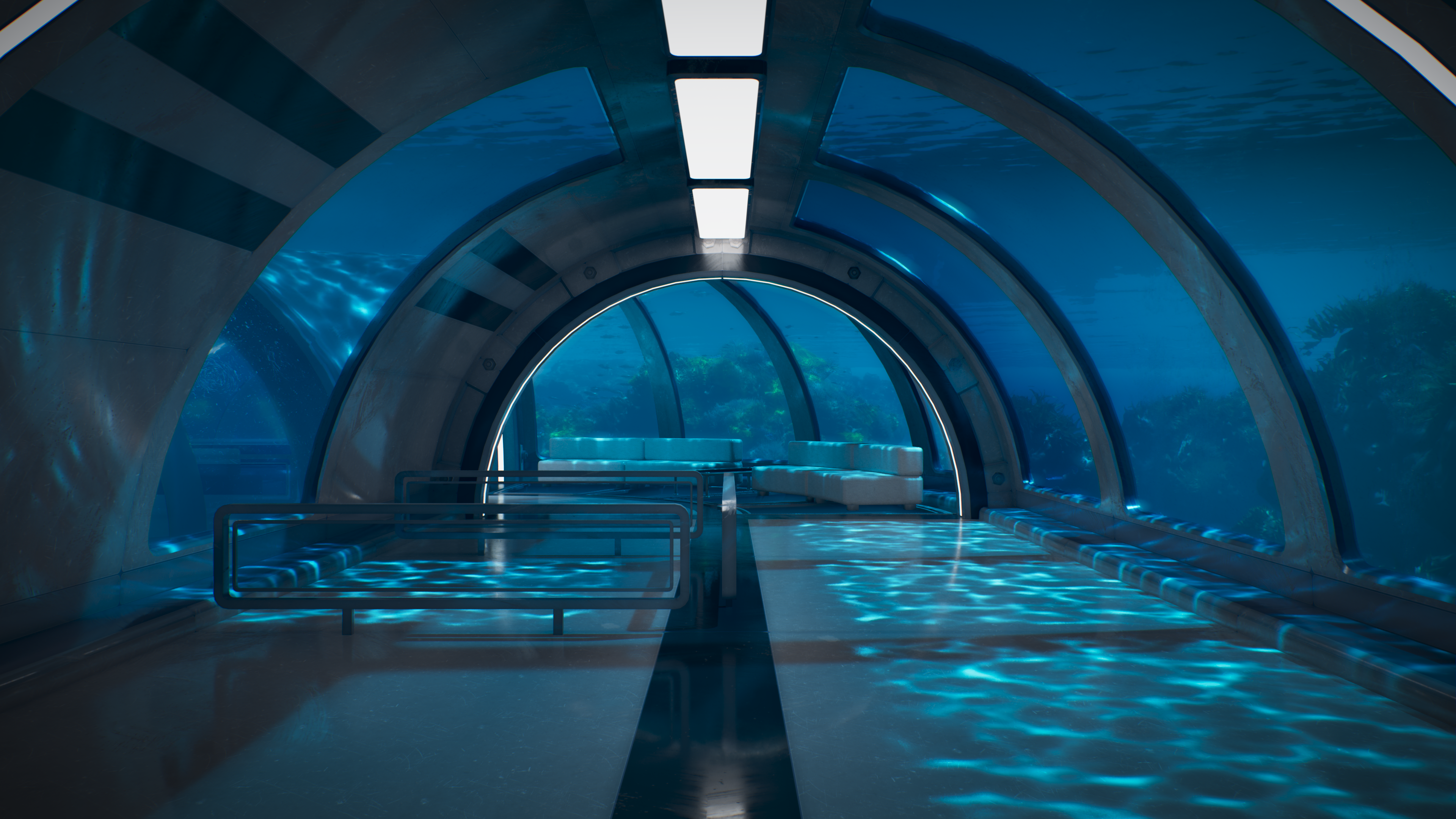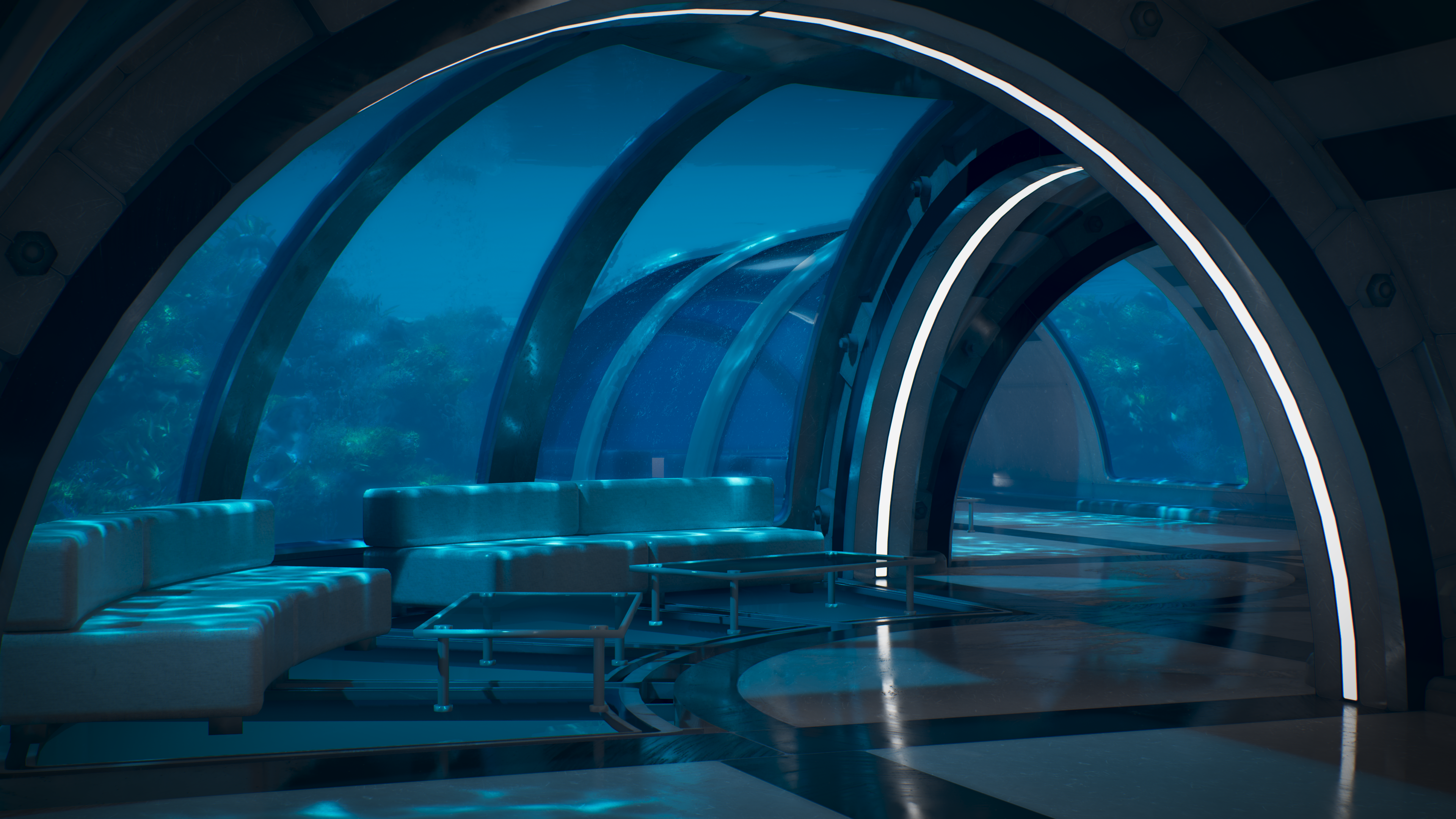 Ocean Module 7 invites you into a tranquil, futuristic world beneath the waves. Inside this serene oceanic station, soft reflections ripple across sleek interiors as schools of fish drift by and glowing corals shimmer in the distance.