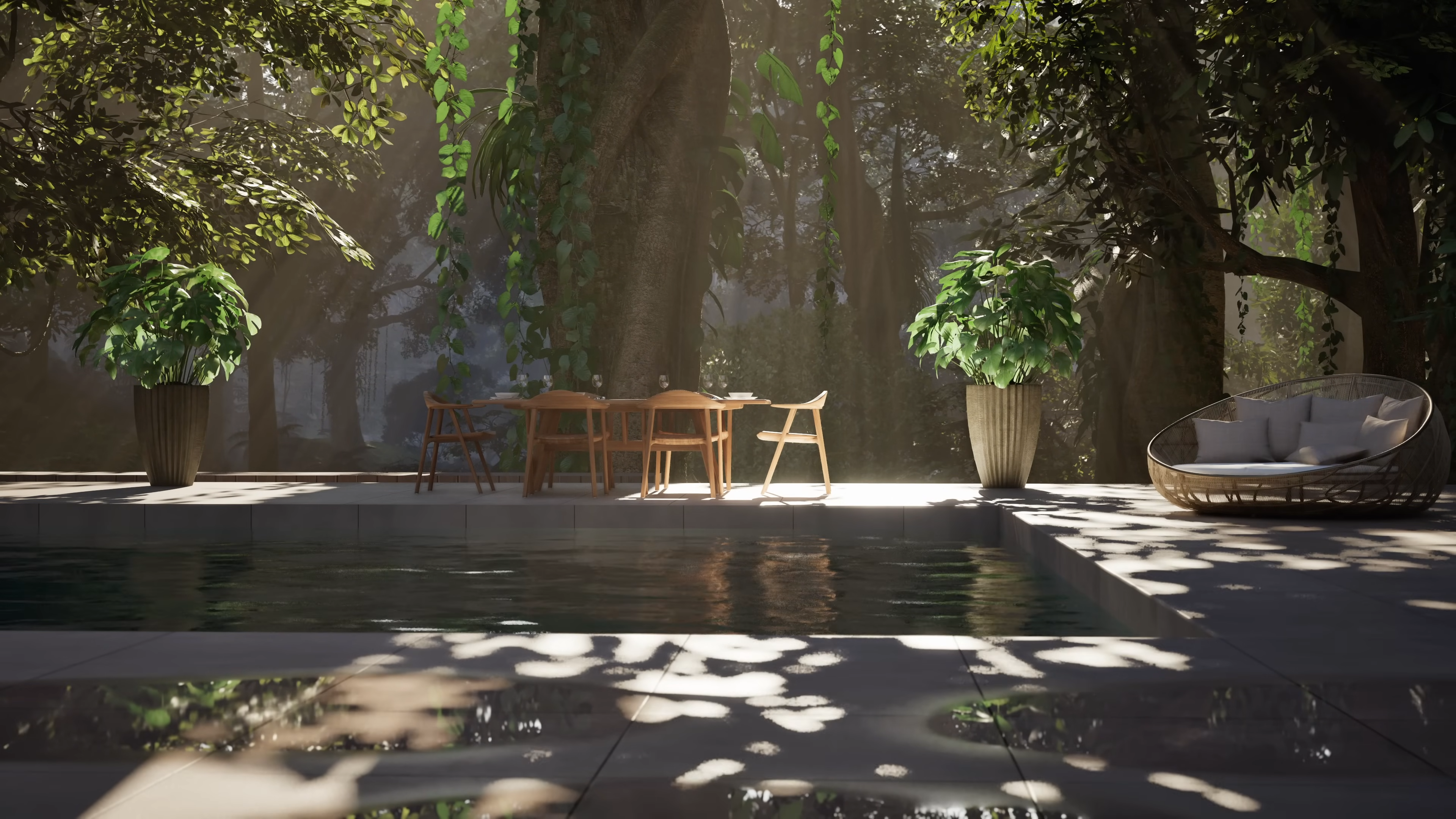 Step into Tropical Escape, a hidden haven nestled within a lush tropical forest. The serene pool stretches before you, reflecting the dappled sunlight filtering through the canopy above. Vibrant greenery surrounds you, and the soft melody of a distant waterfall fills the air, blending with the gentle rustle of leaves in the breeze.